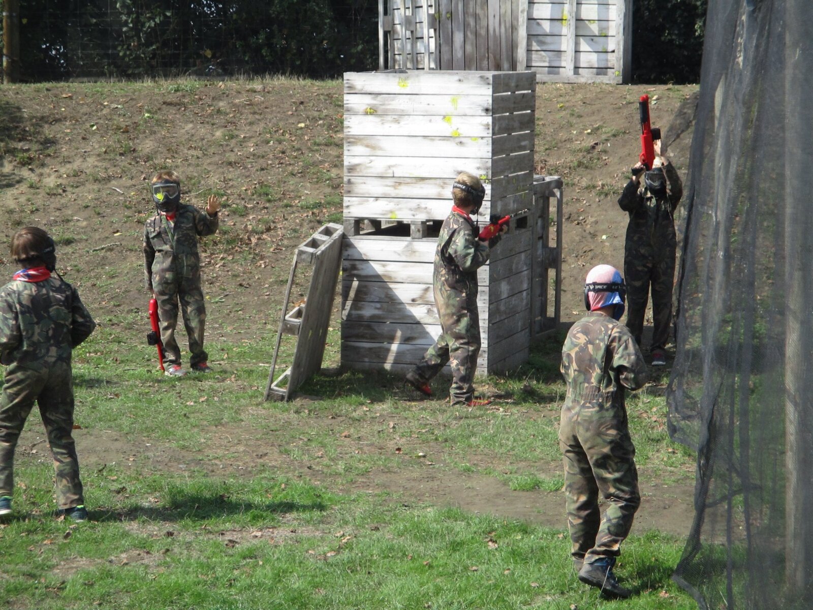Spanning, actie, tactisch spelen, snel lopen, goed mikken, het komt allemaal aan bod in onze paintball missies. Onze geweren zijn speciaal gemaakt voor kinderen. Ze werken niet op Co2-gas zoals de grote paintball geweren maar moeten manueel opgespannen worden. Er zit dus minder kracht achter de verfkogel. Dat wil echt niet zeggen dat de beleving ook maar een klein beetje minder zal zijn, integendeel. Op ons paintball terrein spelen we na het uitleggen van de regels een 4-tal missies die je met je team zo goed mogelijk moet afwerken. Iedereen krijgt een veiligheidsmasker.