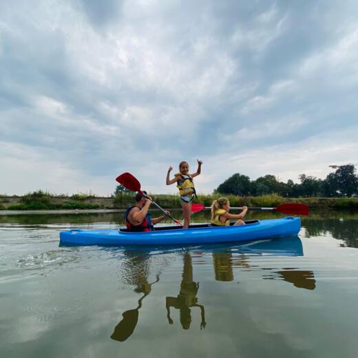 Onze kajaks zijn heel stabiele duokajaks. Zo ruim en stabiel dat je eventueel zelfs een derde persoon tussen de 2 zitjes kan meenemen.